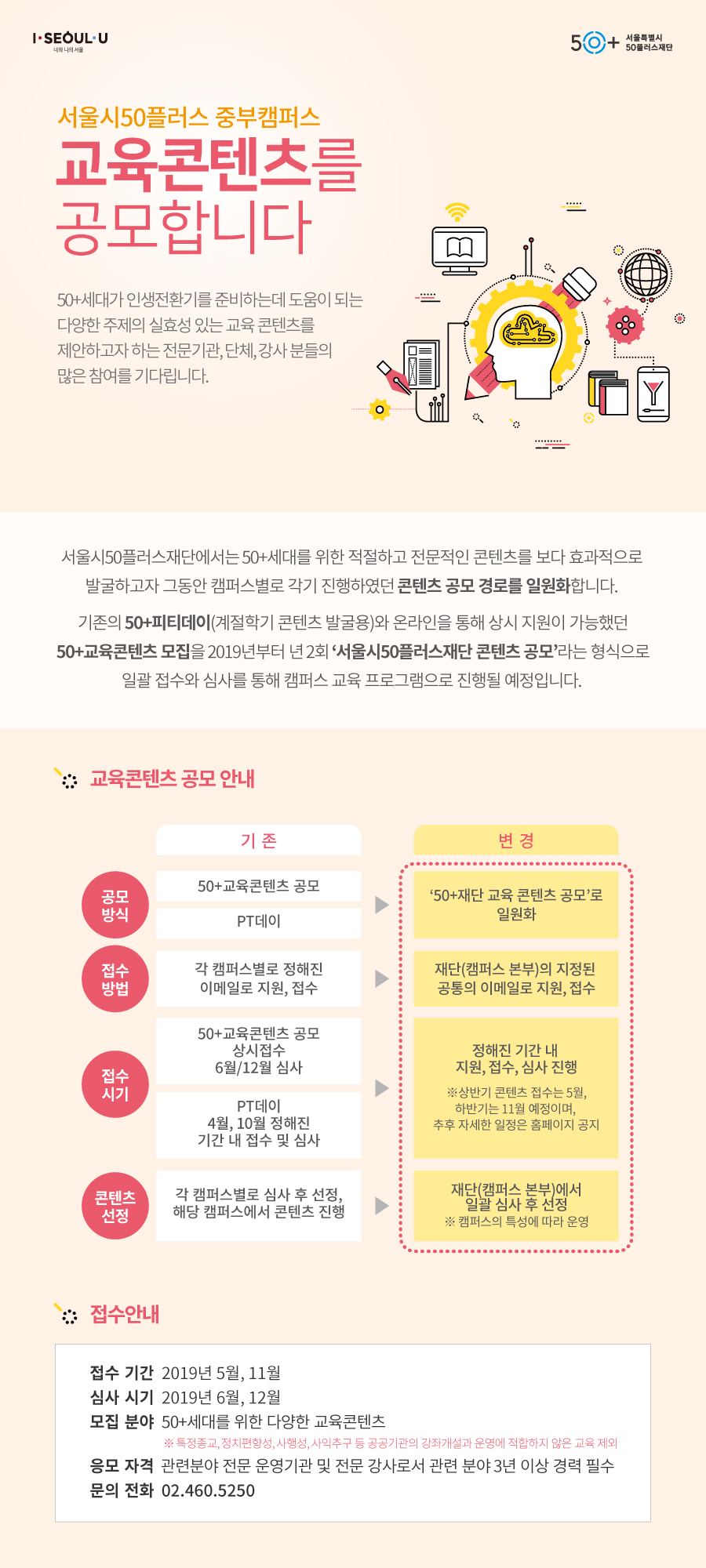 서울시50플러스 중부캠퍼스 (우04147)서울시 마포구 백범로31길 21, 서울복지타운 2층 사업자등록번호 : 232-82-00433