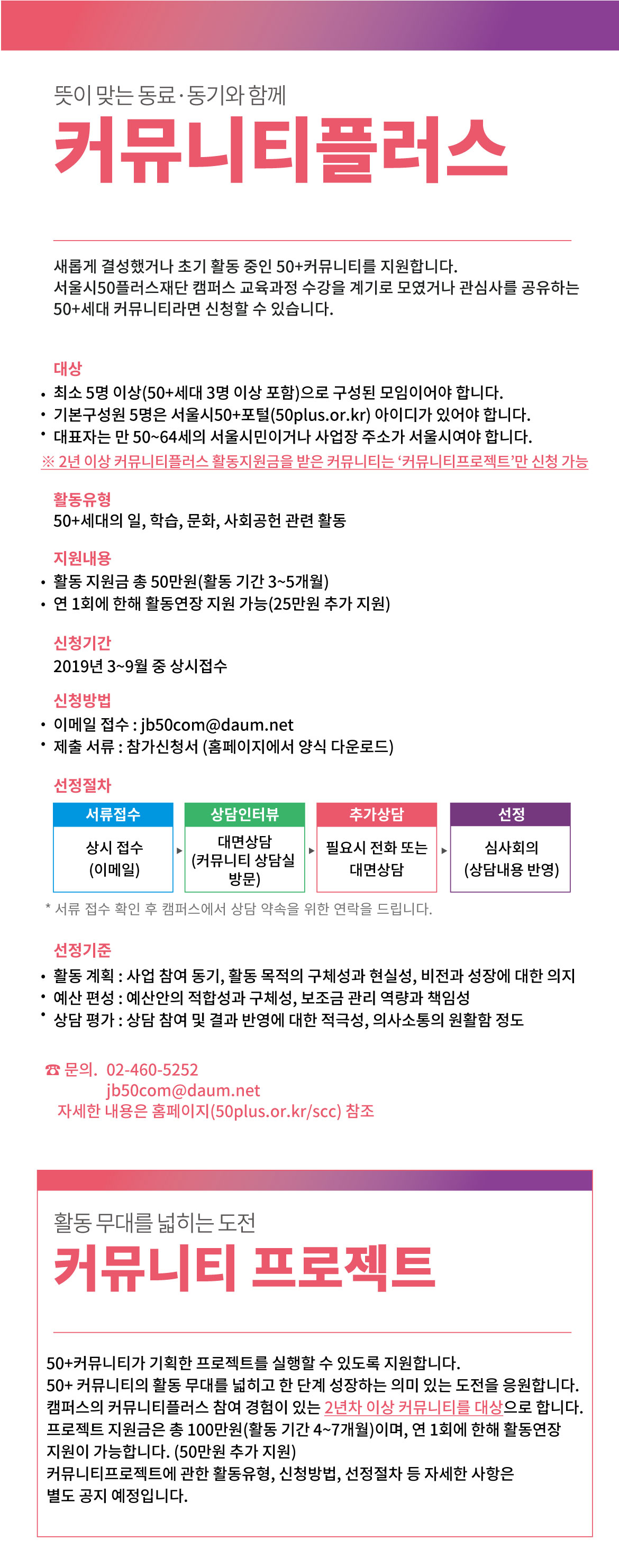 서울시50플러스 중부캠퍼스 (우04147)서울시 마포구 백범로31길 21, 서울복지타운 2층 사업자등록번호 : 232-82-00433