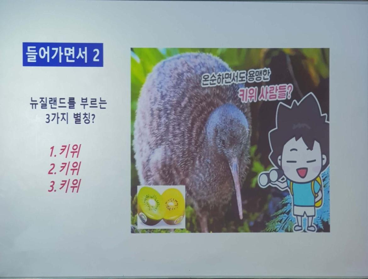 첫 번째 키위는 먹는 과일인 키위이고 두 번째는 뉴질랜드 국조인 키위라는 새이며 세 번째는 뉴질랜드 현지인을 부르는 말이라고 한다.