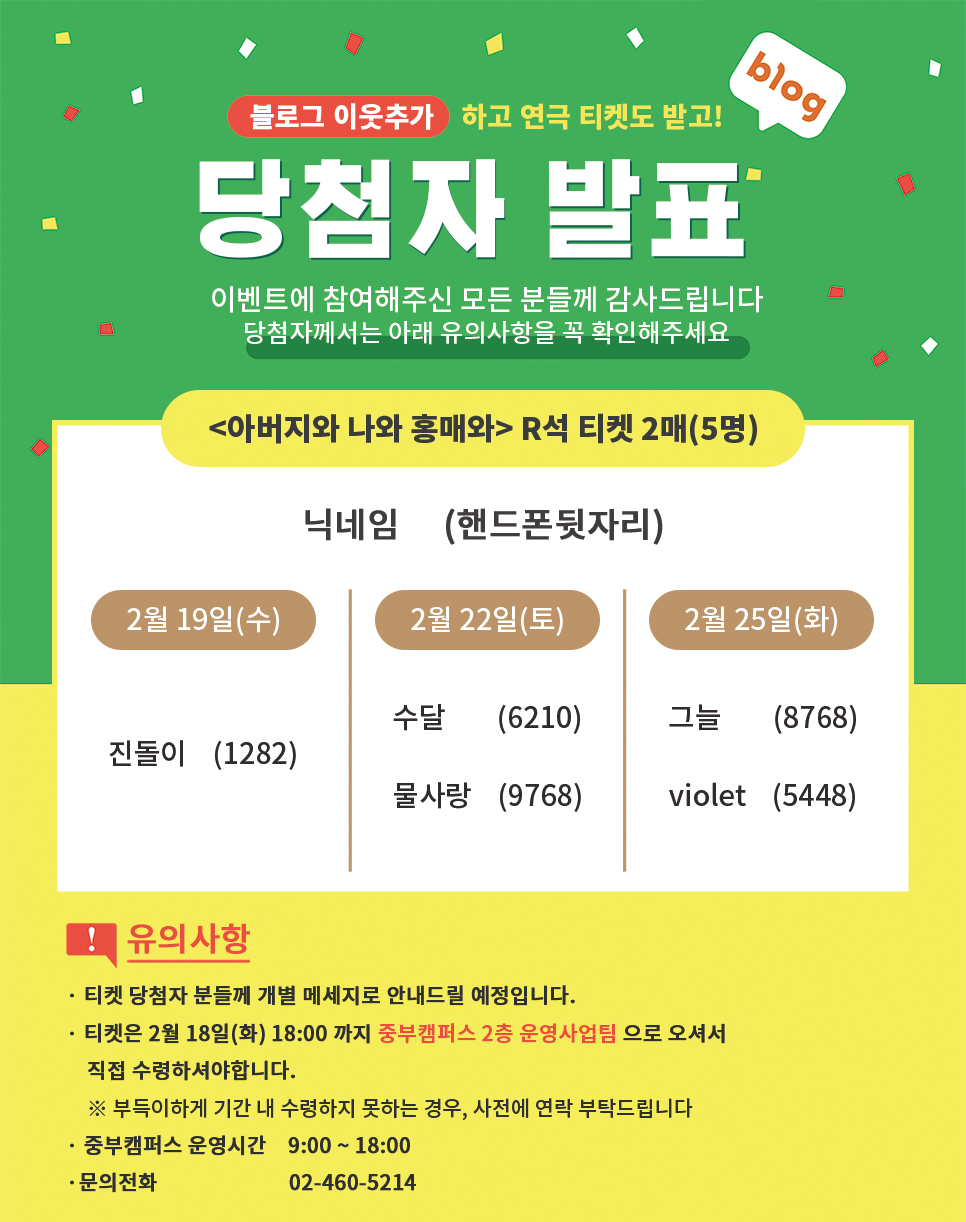- 티켓은 2월 18일(화) 18:00 까지 중부캠퍼스 2층 운영사업팀으로 오셔서 직접 수령하셔야 합니다.