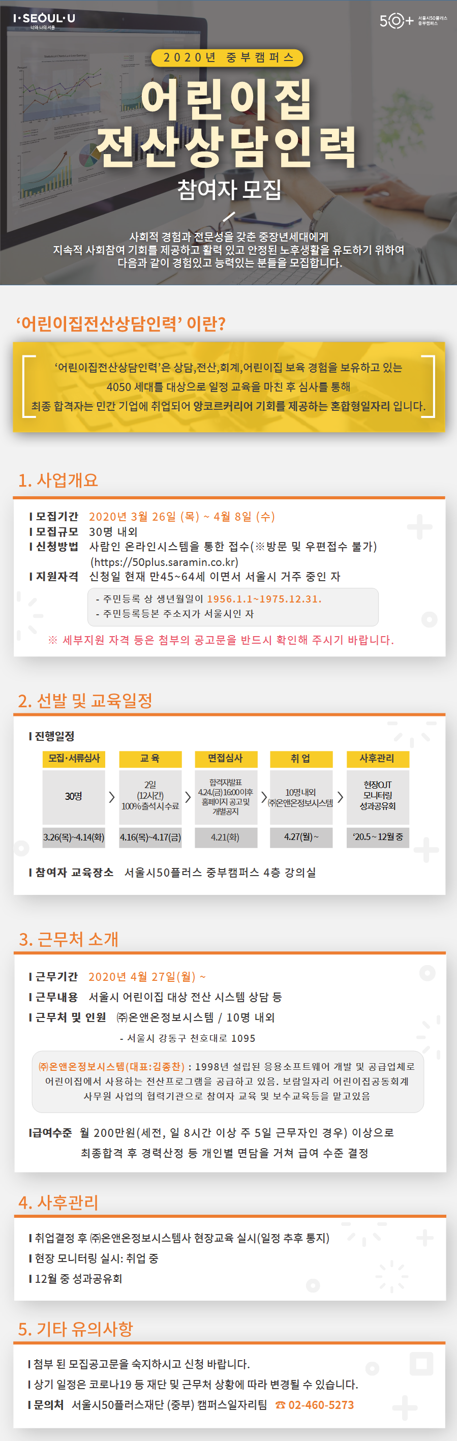 서울시50플러스 중부캠퍼스 (우04147)서울시 마포구 백범로31길 21, 서울복지타운 2층 사업자등록번호 : 232-82-00433