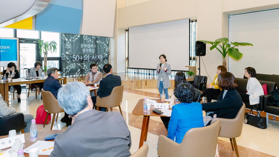 지난 4월 18일 중부캠퍼스에서는 2025년 1천만 고령화 시대, 우리의 준비는?'이란 주제로 매우 특별한 간담회가 열렸다. 이번 간담회는 서울시50플러스재단과 저출산고령사회위원회 산하 고령화 특별위원회 공동 주최로 마련되었다. 서울시·서울시50플러스재단이 선도적으로 추진하고 있는 50+정책 현장, 중부캠퍼스에서 열린 간담회라 더욱 의미있었다. 이날 간담회는 50+복합문화공간인 중부캠퍼스 공간 견학, 커리어모색학부 라디오PD 교육과정 참관, 간담회 순으로 진행되었다. 주요 참석자로는 김상희 저출산고령사회위원회 부위원장(국회의원), 권덕철 보건복지부 차관(고령화 특위 위원장), 김창엽 서울대학교 교수(고령화 특위 민간위원장), 장윤숙 저출산고령사회위원회 사무처장, 이창준 저출산고령사회위원회 기획조정관, 이경희 서울시50플러스재단 대표이사, 고선주 중부캠퍼스 관장, 배경택 보건복지부 인구정책총괄과장, 이민재 고용노동부 고령사회인력정책과장, 연령별 사례발표자  등을 비롯한 많은 이들이 참석해 높은 관심을 보였다.