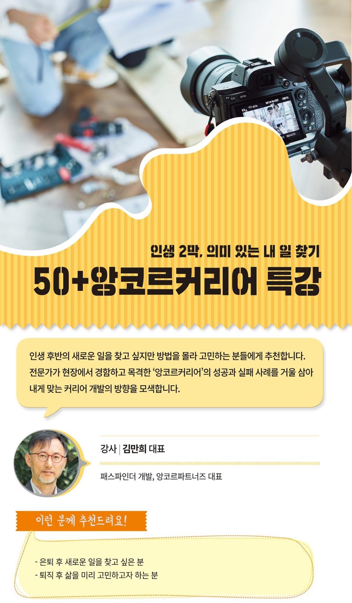 - 현장에서 바라보고 경험한 앙코르커리어 사례를 거울 삼아 인생후반의 일, 활동을 재정의하고 내게 맞는 앙코르커리어 발굴을 함께 모색해 봅니다.
