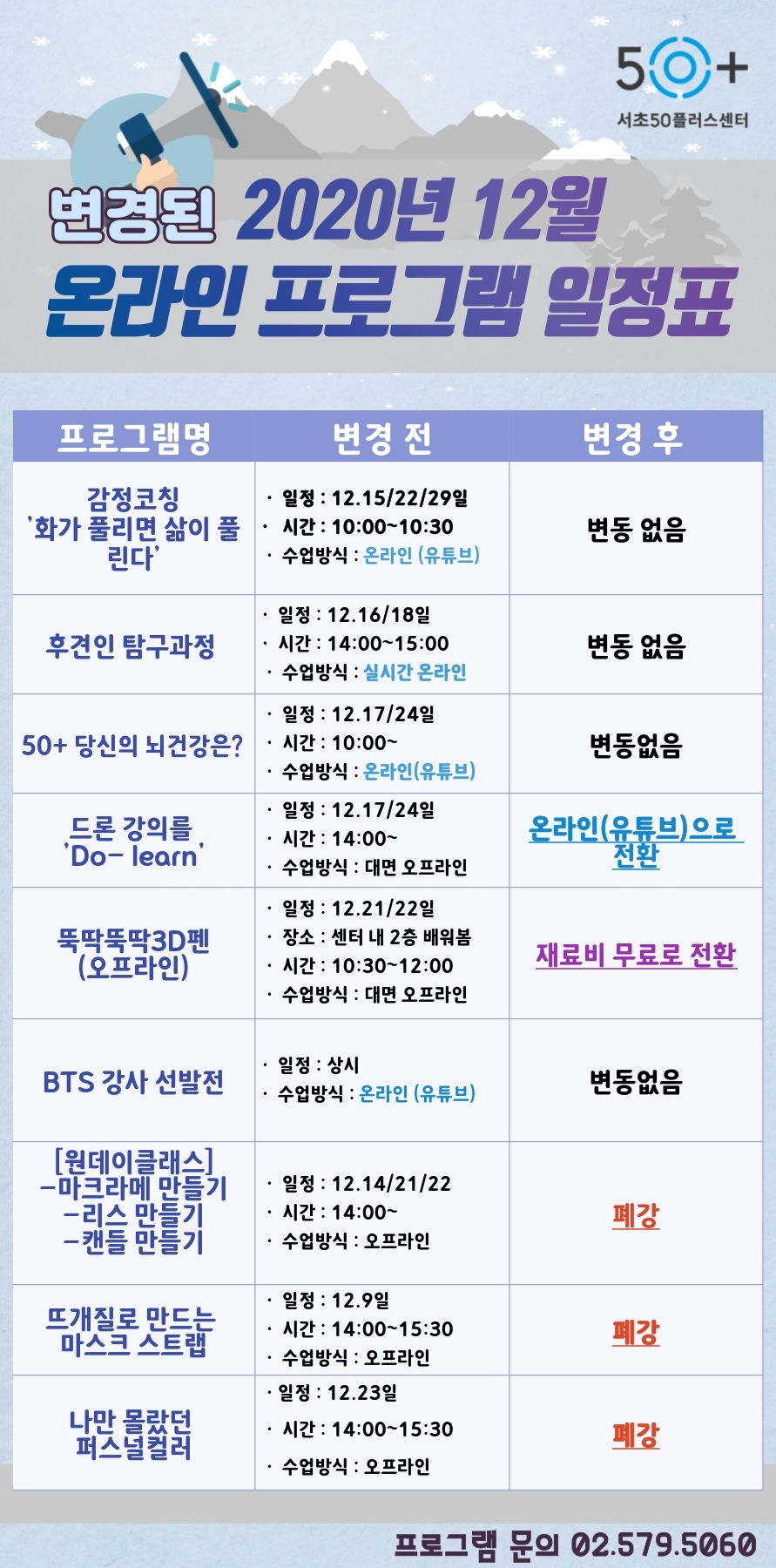 우리 센터 12월 프로그램을 일부 온라인 수업으로 전환 또는 폐강하게 되었습니다.