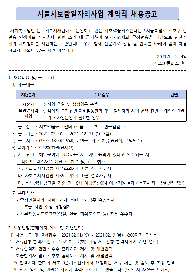 서울시 서초센터 | [채용]서초50플러스센터 서울시 보람일자리사업 직원채용 안내