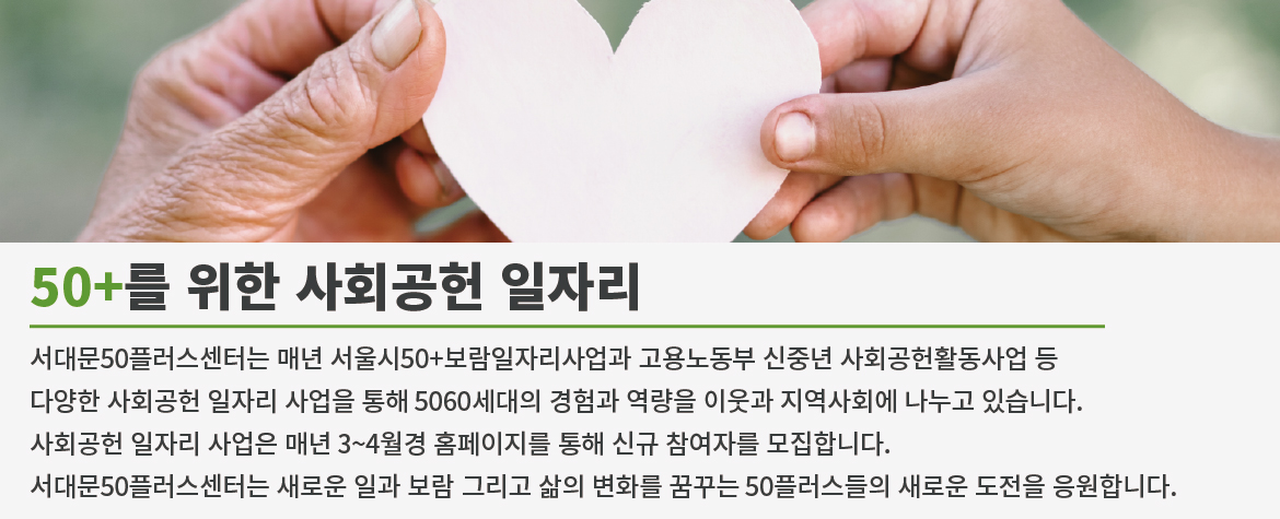 • 서울시50+보람일자리사업 : 중장년사업지원단, 지역복지사업단, 지역자원순환실천단, 시민기자단