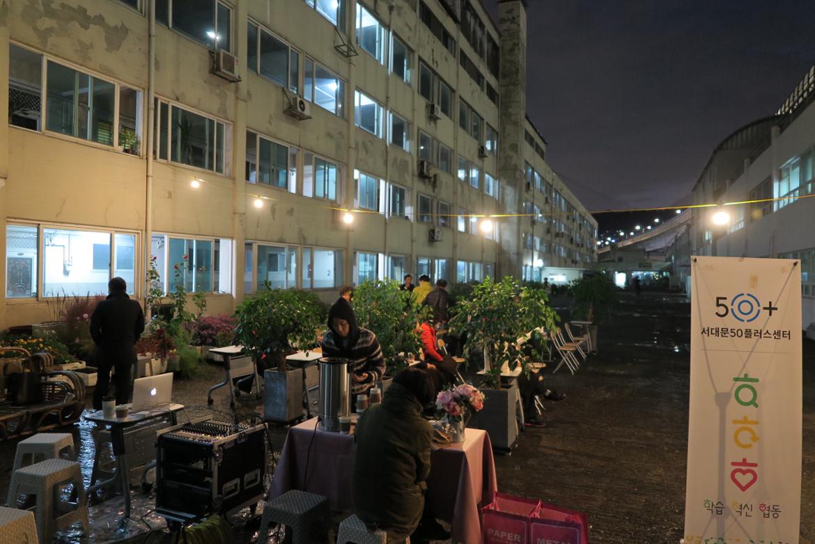 그런데 어느덧 영화의 클라이맥스가 다가올 무렵, 한두 방울 빗방울이 듣더니 이내 후두둑 쏟아져 내리기 시작했다. 계속 영화를 관람할 수 있을까 걱정하는 순간, 관객들은 너나할 것 없이 실내에서라도 계속 보기를 원했다. 갑자기 분주해진 센터 직원들을 보며 나이든 어르신들까지 비를 맞으며 직접 의자를 옮기기 시작했다. 관객들의 도움과 서대문50플러스센터 직원들의 신속한 대응으로 영상 장비를 모두 옮기고 영화는 실내 까페 공간에서 계속 이어졌다.