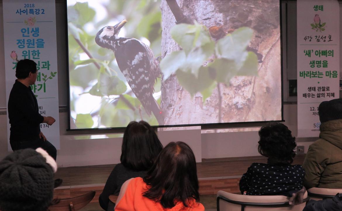 두 번째 강의는 前 서남대 생명과학과 교수, 지금은 생태전문작가로 활동하는 김성호 씨로부터 본인의 별명인 ‘딱따구리 아빠’로 불리게 된 첫 책 ‘큰오색딱따구리의 육아일기’에 대해 직접 듣는 시간이었다. 책 이야기 속에는 딱따구리 뿐만 아니라 그의 지난한 인생경험담이 고스란히 담겨 있었다.