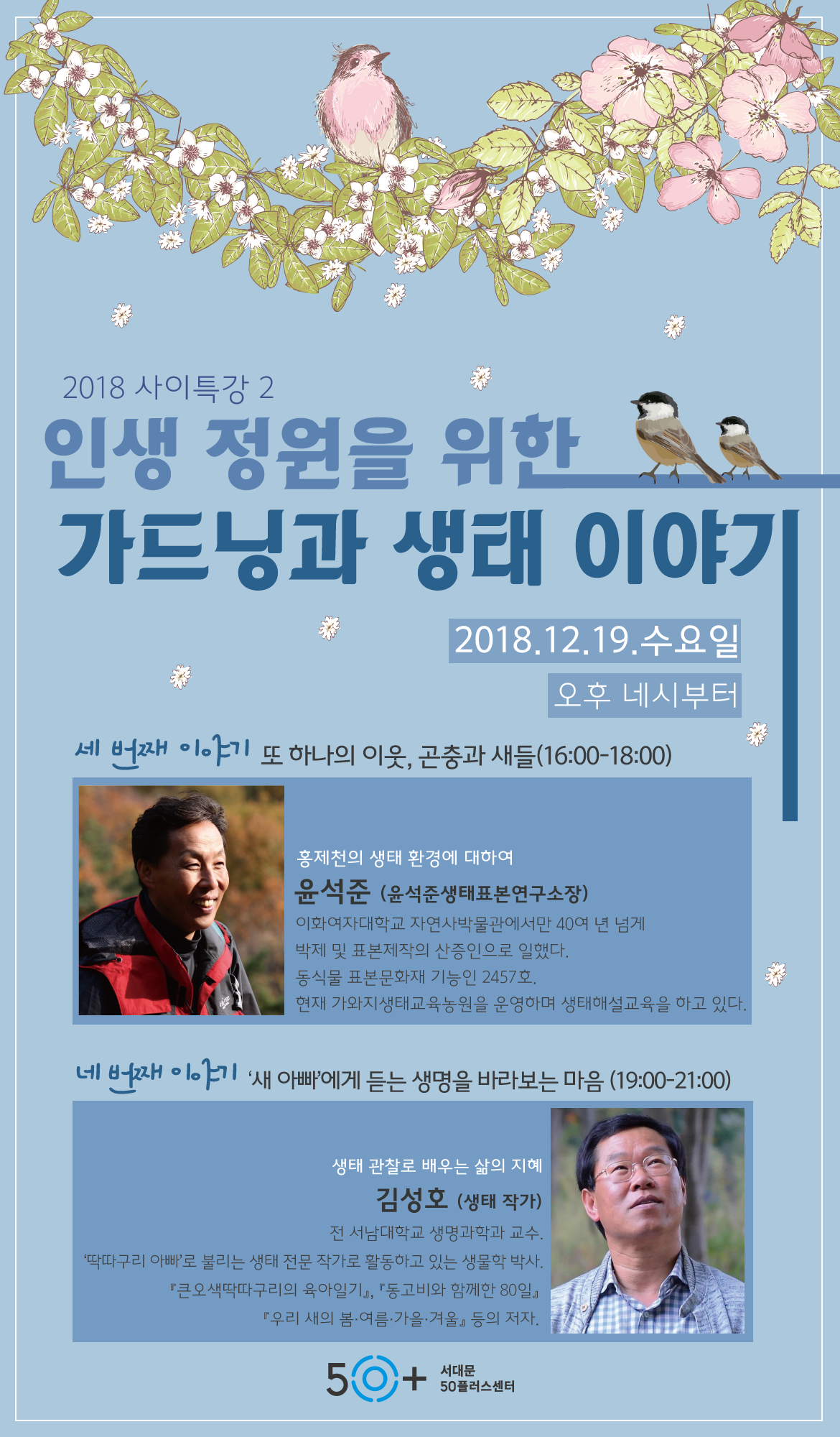12월 19일 오후, <인생정원을 위한 가드닝과 생태이야기>의 생태 편 특강을 듣기 위해 다시 서대문50+센터로 갔다. 지난 강의도 그간 들어왔던 가드닝 강좌와 달리, 정원산업과 가드너의 관점에서 바라본 정원의 사계까지 깊이 살펴볼 수 있어서 유익했는데, 이번에는 정원과 관련된 생태이야기라니 한층 더 궁금증을 불러일으켰다.