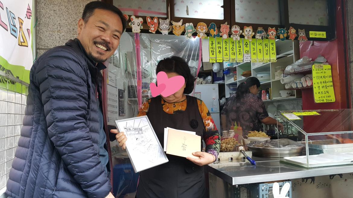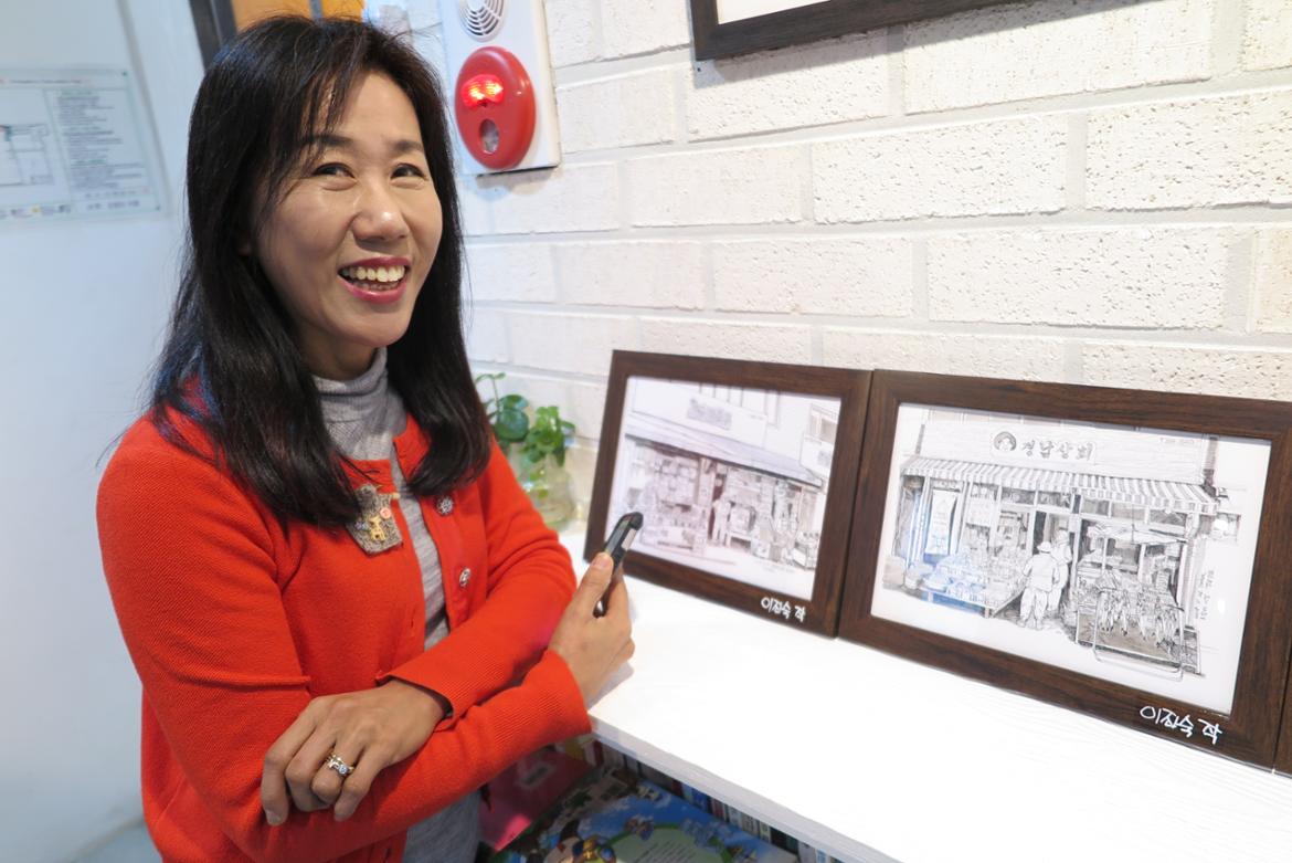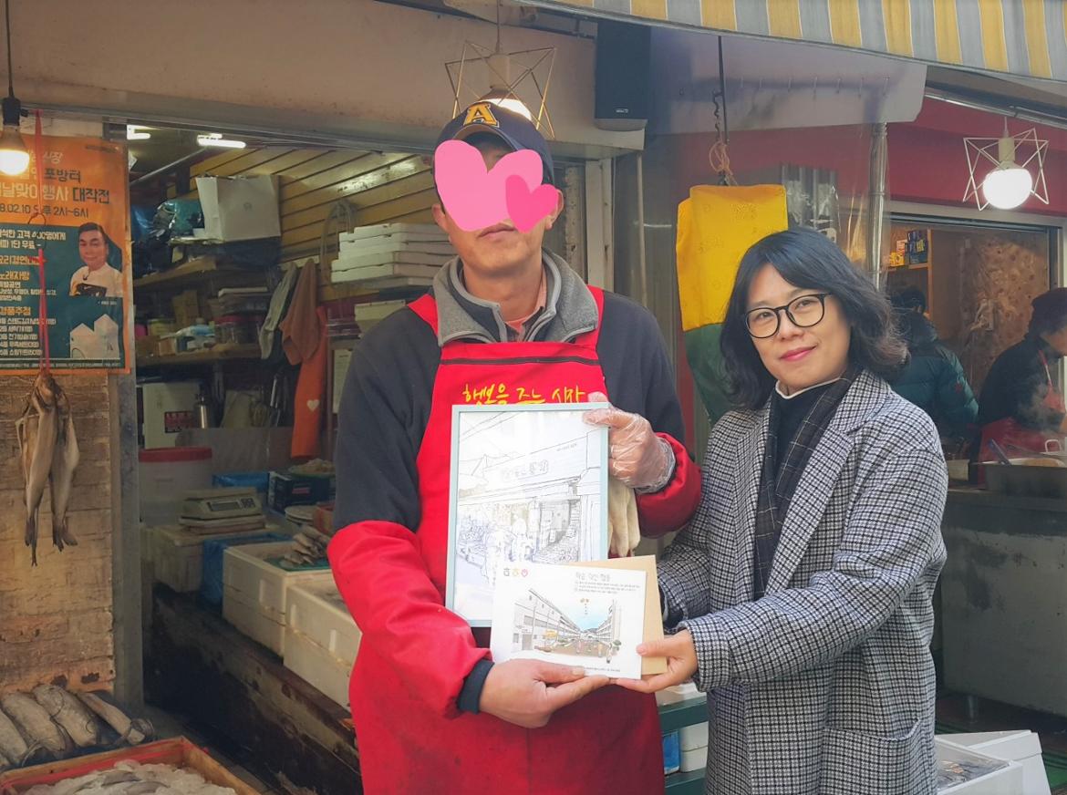 포방터 시장 상인분들께 정성듬뿍 애정듬뿍 펜 드로잉 그림을 전달하며
