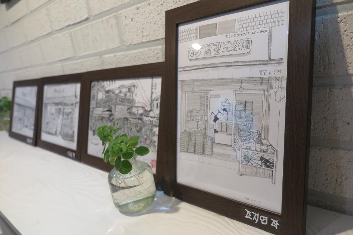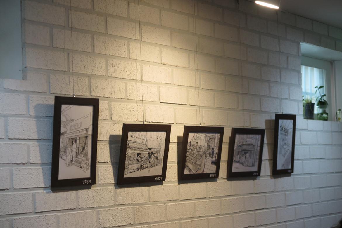 옹기종기 걸려있는 펜 드로잉 그림들이 손님들을 맞이하고 있어요.