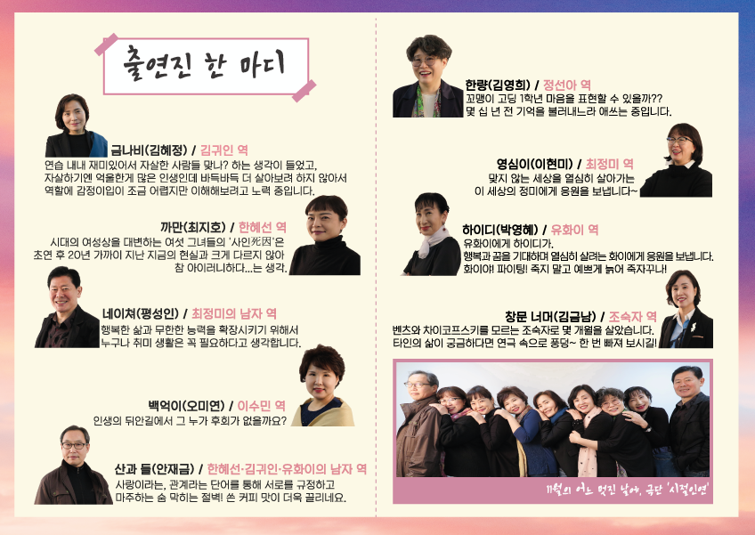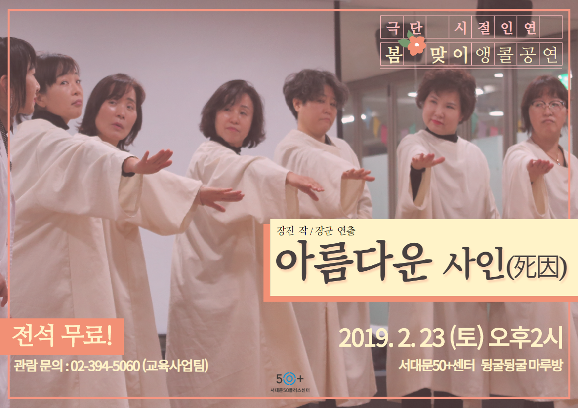 극단 '시절인연' 의 열정은 멈추지 않는다! 지난 2018년 제2회 파티 잇-다에서 첫 선을 보인 서대문50플러스센터 50+ 연극 교실 학습자들로 꾸려진 극단 '시절인연'의 작품 <아름다운 사인>이 다시 무대 위에 오릅니다.