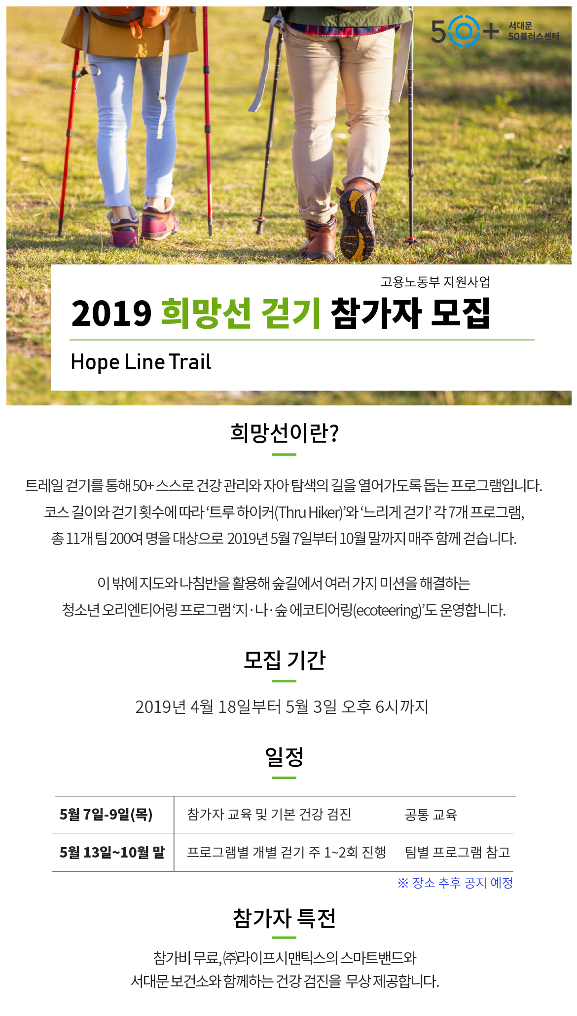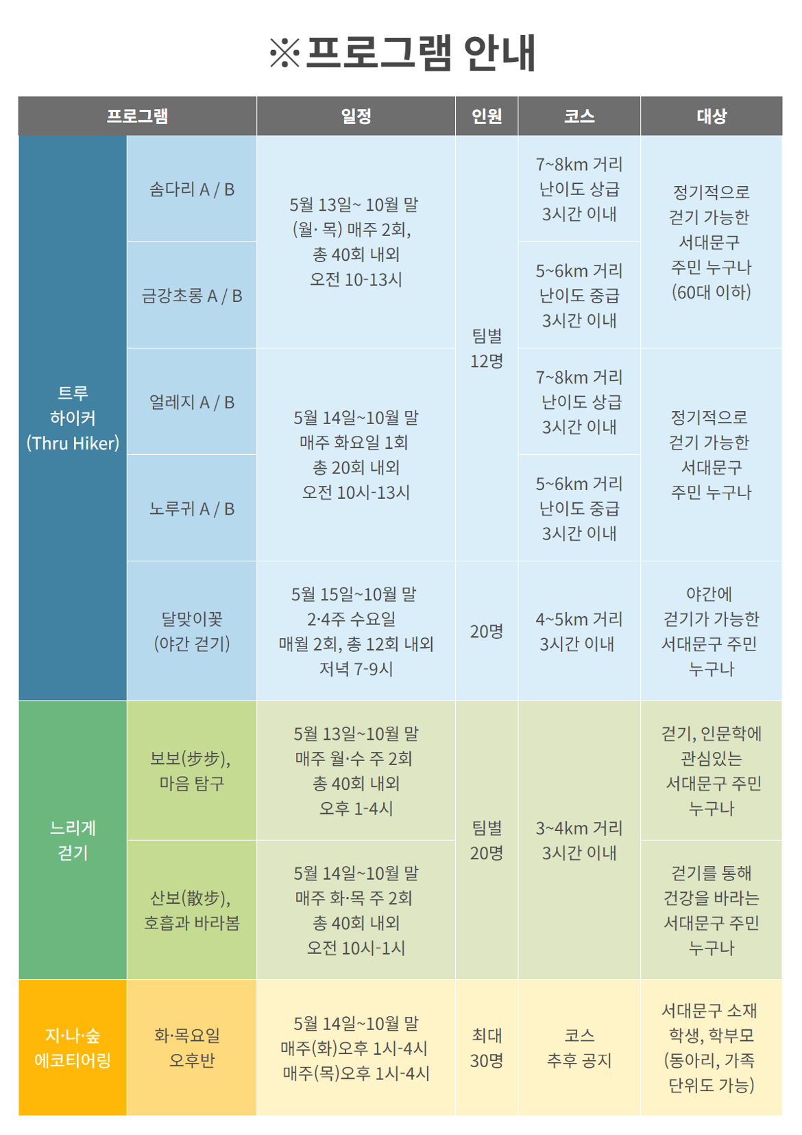 함께 걸으며 희망을 잇자 -서대문50플러스센터, 트레일 희망선 걷기 참가자 모집 -5월~10월, 트루 하이커, 느리게 걷기, 지·나·숲 에코티어링 프로그램 운영