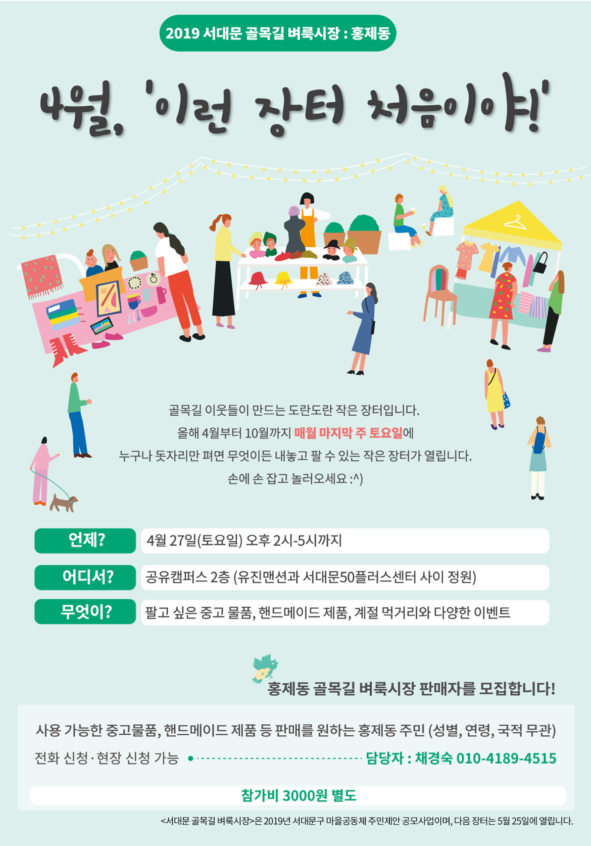 커뮤니티 한 땀에서 서대문구 마을공동체 주민제안 공모사업으로 서대문 골목길 벼룩시장을 열게 되었습니다. 4월부터 10월까지 매월 마지막 토요일이면 소소한 장이 섭니다. (7월 한 달만 쉬어요)