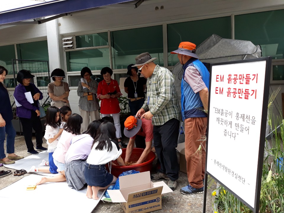 서대문50플러스센터 커뮤니티 홍제천생활환경실천단에서는 EM 흙공 만들기 실습을 어린이들과 함께 했습니다. 보드라운 황토와 EM활성액을 반죽해 만든 흙공을 발효시켜 하천에 던지면 유용한 미생물 작용으로 물이 맑아진대요.