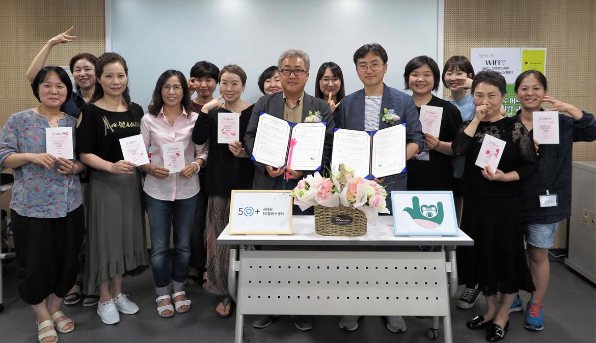 업무협약식은 2019년 상반기 <서대문50+수어학교-손으로 만나는 따뜻한 세상> 강좌의 수료식과 함께 열렸다. 강좌는 서대문수어통역센터 사무국장 장수정 씨가 강사로 참여했고, 14명의 학습자가 49일부터 매주 화요일과 목요일, 2회 총 24회 수업을 통해 기초과정을 이수했다. 이들은 강좌 수료식을 마치고 서대문구 수어통역센터 자원봉사단 ()오공을 결성, 지속적인 활동을 함께하기로 약속했다. 손오공은 ()으로 오십플러스가 함께()한다는 뜻이다. 이날 손오공 회원이 된 한 학습자는 최근 새로운 일을 시작하면서 영어만 스펙이 되는 세상에서 수어로 소통하는 능력 덕분에 후한 점수를 받았다.”며 면접 과정에서 수어로 자기소개한 경험담을 전하기도 했다.