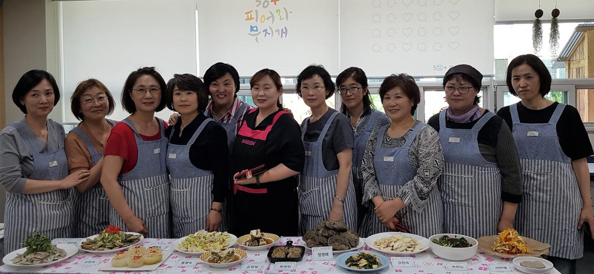 2019 상반기 <시니어 건강(요리) 지도사 과정> 학습자들이 직접 만든 건강 요리 앞에서 기념 촬영을 하고 있다. 이 강좌 수료 후 결성한 커뮤니티 시니어건강지도사가 하반기 <신바람 건강밥상> 강좌를 연다.