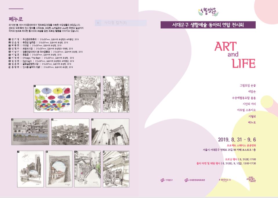커뮤니티 '페누루'가 서통발랄 서대문구 생활예술 동아리 연합 전시회 ART and LIFE에 참여합니다. 8월 31일부터 9월 6일까지 서대문구 연희로 25길 98 카페 보스토크 1층에서 열리는 서대문구 생활예술동아리 연합 전시회 ART and LIFE에는 페누로 외에도 그림모임 손끝, 세담손 등 총 7개 동아리가 함께 합니다.