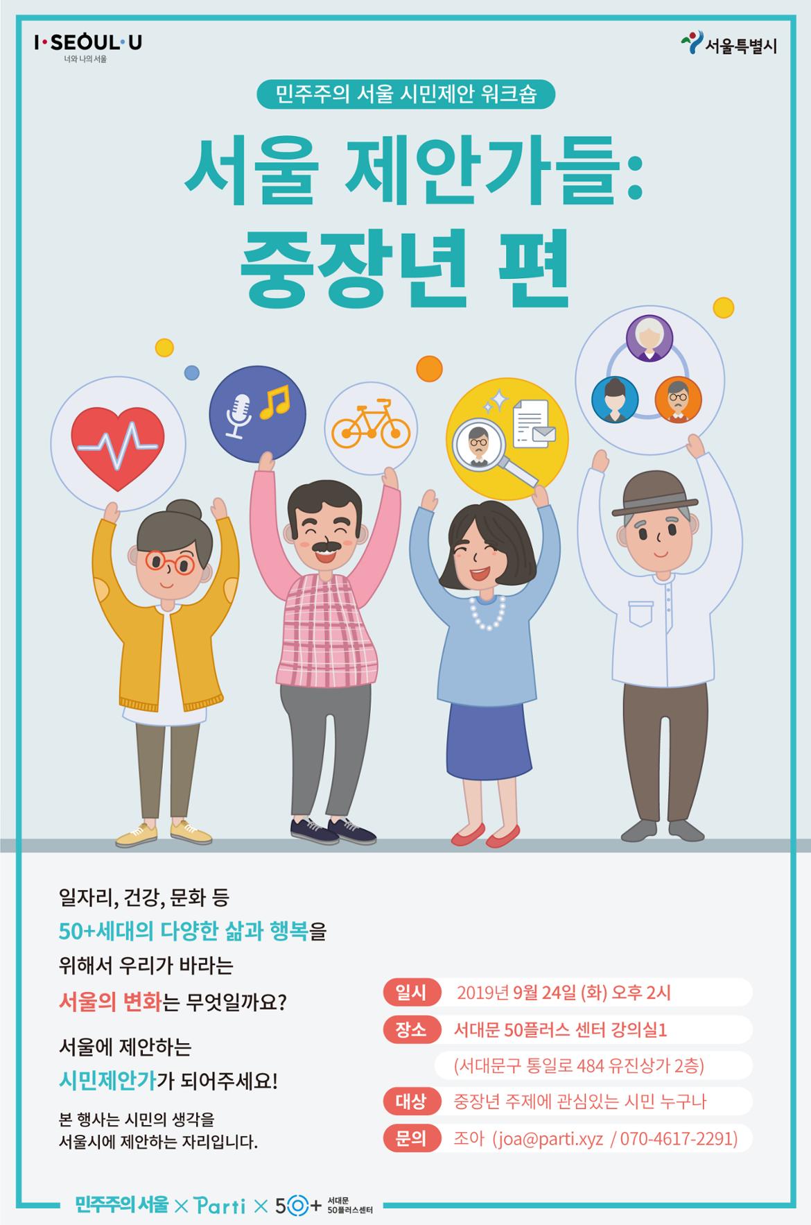 서대문50플러스센터(센터장 이수빈)924일 민주주의 서울·빠띠(Parti)와 함께 <서울 제안가들 중장년 편> 시민제안 워크숍을 연다.