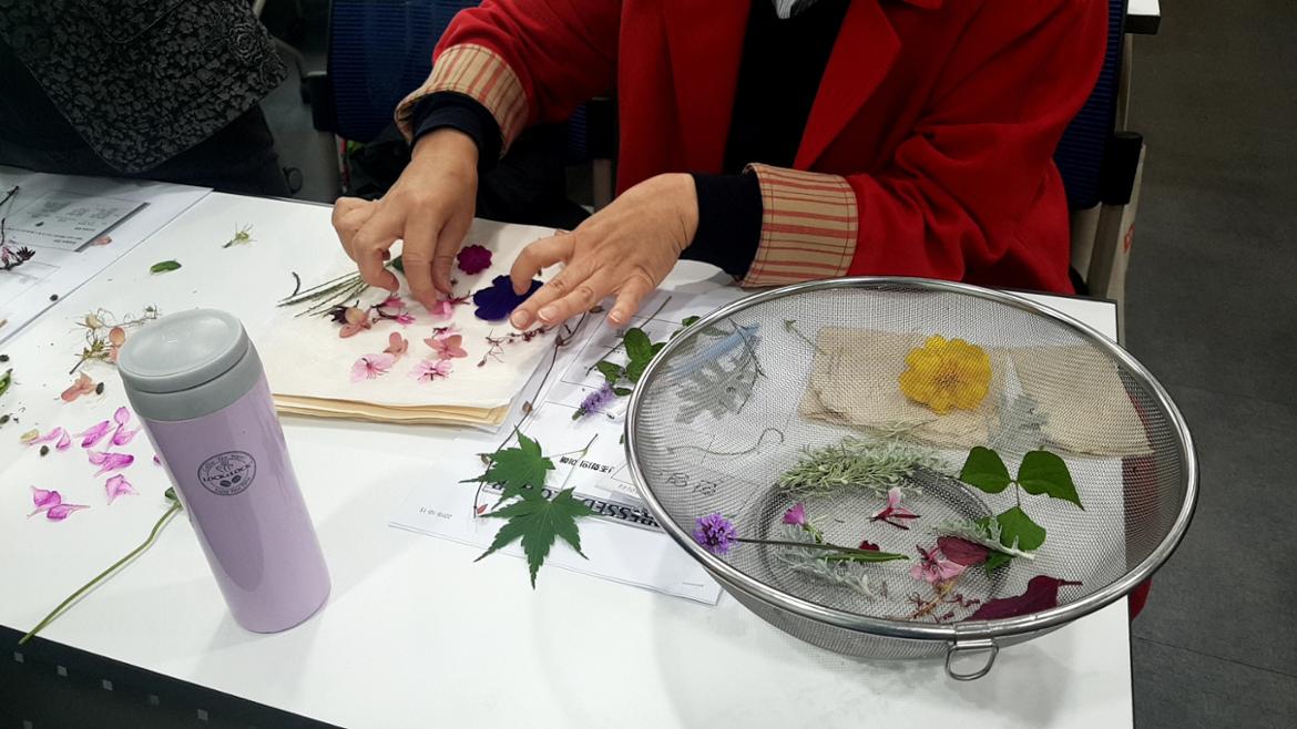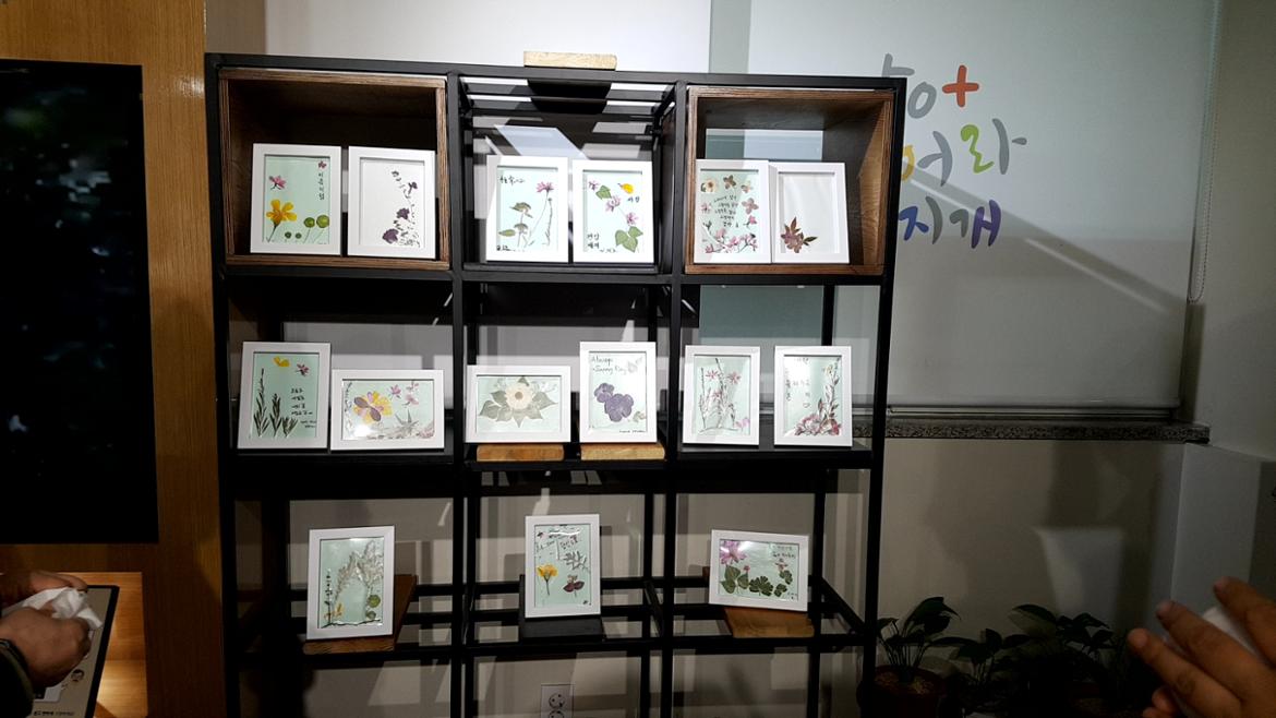 옥상에 예쁘게 피어있는 꽃과 풍성한 나뭇잎들을 채취해 누름꽃 만들기를 하며, 일주일 후 어떤 모습으로 변해 있을 지 궁금해하던 모습도 떠오릅니다. 학습자들의 압화 작품으로 액자와 컵을 꾸미고서 서대문50플러스센터에 전시도 했습니다.