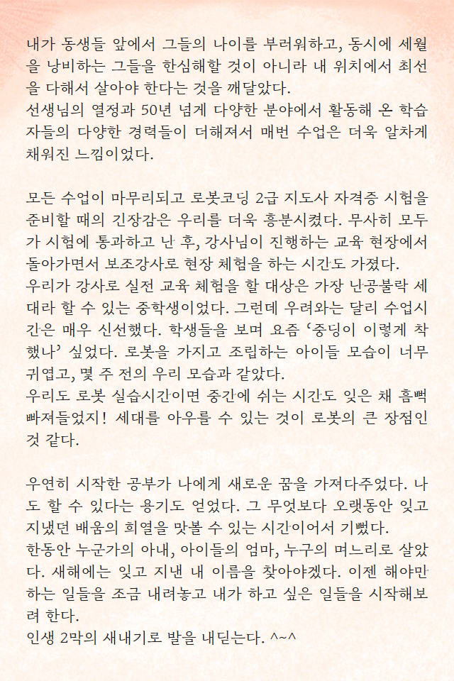 *지난 2019년 하반기 <50+로봇코딩 강사 양성과정>을 수료한 여경란 학습자의 교육 후기입니다. 여경란 님은 현재 로봇 코딩 2급 지도자 자격증을 취득하고, 동료 학습자들과 함께 서대문50플러스센터에서 로봇 코딩 교육 활성화를 위한 커뮤니티를 준비하고 있습니다.