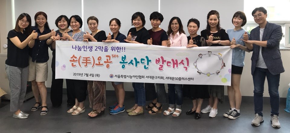 <서대문50+수어학교-손으로 만나는 따뜻한 세상> 강좌를 마치고 서대문구 수어통역센터 자원봉사단 ‘손(手)오공’을 결성한 50+들.