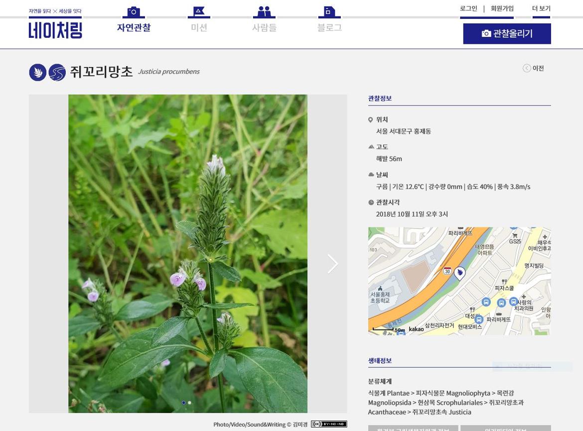 네이처링에 공유된 홍제천생활환경실천단 김미경 회원의 기존 홍제천 탐사 자료. 네이처링 앱으로 언제 어디서나 자연 관찰 자료 검색하고 공유할 수 있다.