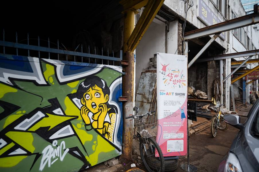 문래동 철공소 골목에 있는 문래창작촌에 내걸린 50+아트쇼 안내문.