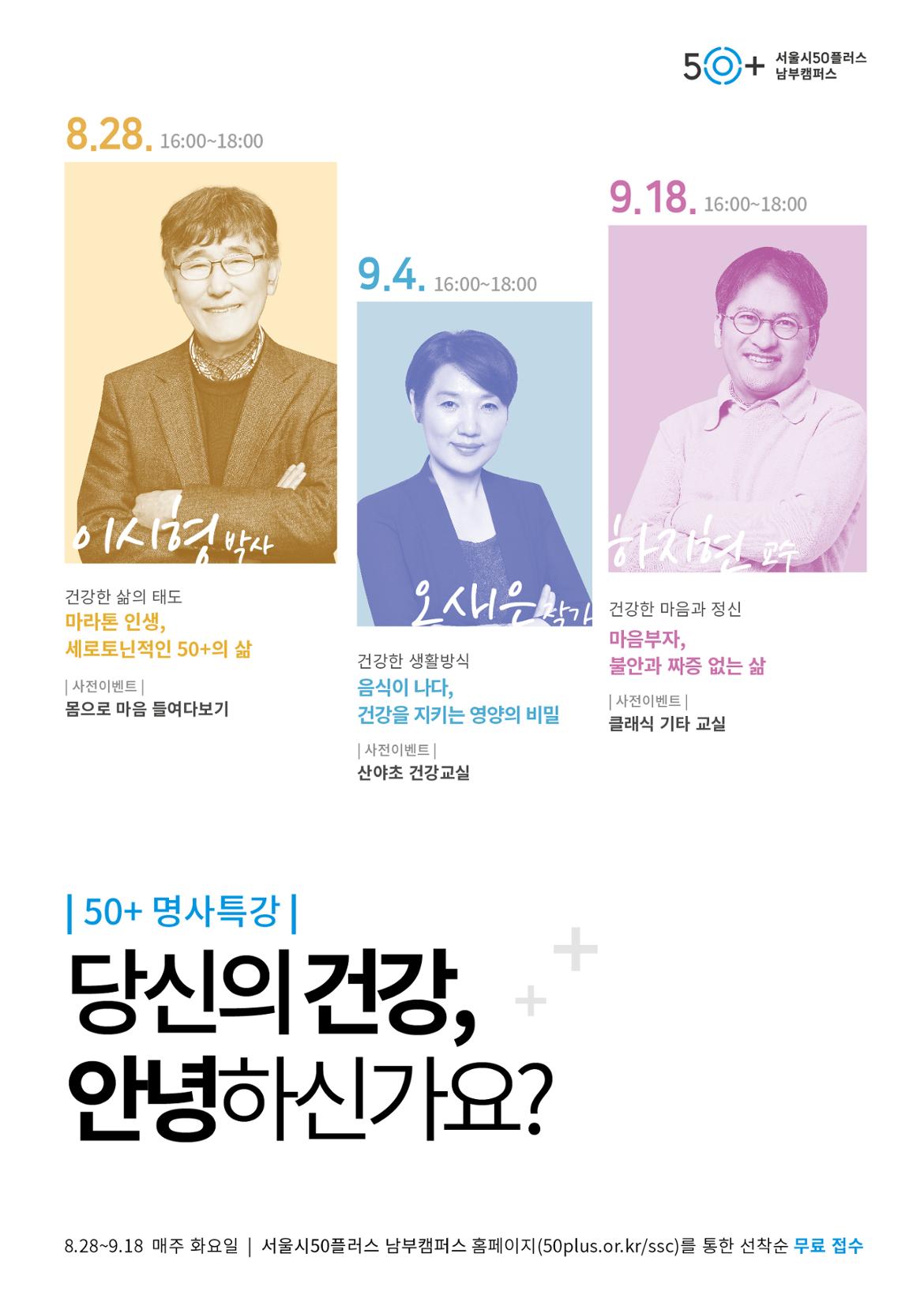서울시50플러스 남부캠퍼스는 9월 18일(화) 오후 4시 하지현 교수의 “마음부자, 불안과 짜증이 없는 삶”이란 제목의 명사특강을 개최한다.
