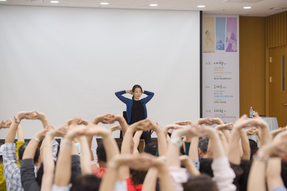 이시형 선생님의 첫 번째 특강 <건강한 삶의 태도>가 지난 8월 28일 서울시50플러스 남부캠퍼스 꿈꾸는 강당에서 열렸다. 이날 특강은 사전 이벤트로 남부캠퍼스에서 <몸으로 마음 들여다보기> 프로그램을 진행하는 노정숙 선생님의 성찰 요가 시연으로 시작되었다. 비록 짧은 맛보기 시연이었지만, 간단하게 몸을 움직이는 아사나(신체 움직임의 요가 용어)를 통해 내 몸이 바르게 정렬되고 어깨가 시원해지는 느낌을 받았다.