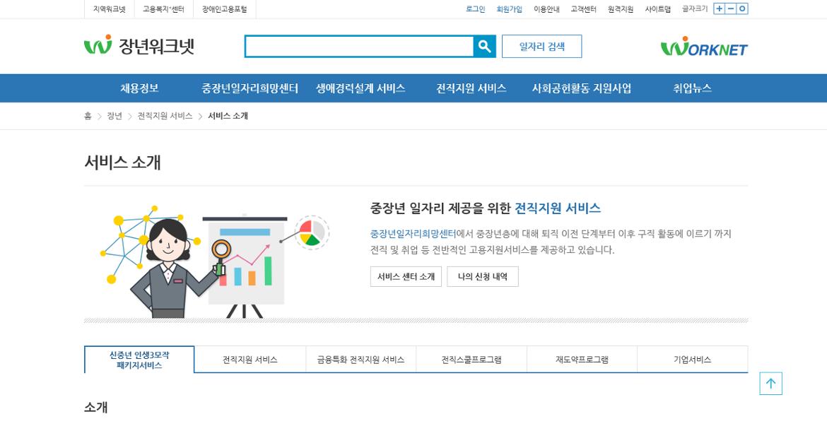 중장년일자리희망센터는 서울, 부산, 광주 등 전국 32개 지역 센터를 운영 중으로 만 40세 이상 중장년 대상 생애경력 설계 및 전직·취업지원 서비스를 무료로 제공하고 있다. 특히, 중장년층에 근로 단계에 따라 재직자 대상 생애경력 설계 서비스, 퇴직예정자 대상 전직스쿨 프로그램, 구직자 대상 취업지원 서비스 등을 지원한다.