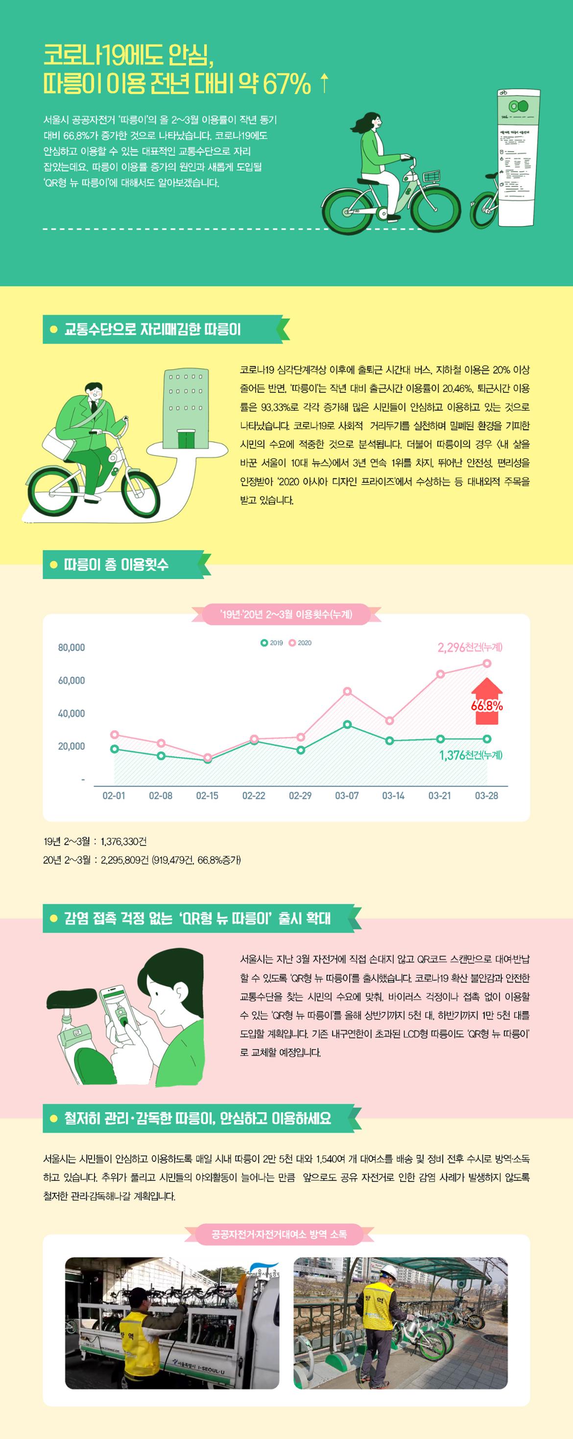 따릉이는 코로나19로 이용객이 급증했다. 2019년 2~3월 이용객은 137만 6,330건 이었는데, 2020년 2~3월 229만 5,809건으로 늘어 전년 동기 대비 66.8% 증가했다. 따릉이는 서울시민이 뽑은 서울시 10대 뉴스에 3년연속(2017~2019) 1위로 뽑혔다. 자전거 택시도 7월에 시범 도입됐다. 친환경 전기택시 마카롱택시 10대에 거치대를 설치해 최대 3대까지 거치 가능하다. 자전거 1대당 운송료 3천 원이 추가되는데, 마카롱 택시앱을 통해 예약하고 이용할 수 있다.