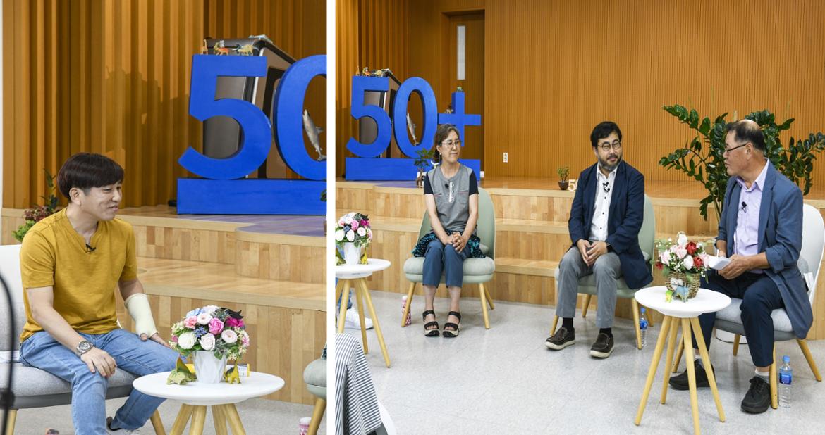 모든 강연은 서울시50플러스재단 유튜브 채널에서 시청할 수 있다. 라이브로 진행되는 생생한 토크콘서트다. 라이브가 진행되는 남부캠퍼스 4층에 올라가니 "쉿, 유튜브 라이브 방송 진행 중~"이라는 안내문이 먼저 나를 맞이한다. 방송 진행에 방해되지 않도록 조용히 ‘꿈꾸는 강당’ 문을 밀고 들어섰다. 준비요원들의 분주한 움직임이 눈에 들어온다. 그리고 준비된 모습으로 대기하는 토크콘서트 참여자들의 모습도 보인다. 코로나의 여파로 많은 분들이 직접 방청하지는 못했지만, 유튜브 채널을 통한 참여 호응도가 제법 큰 듯하다.