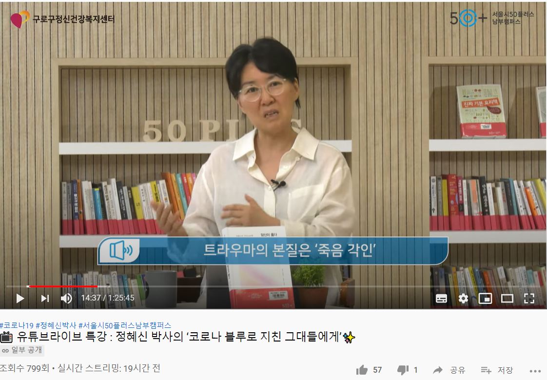 이날 유튜브강의에는 예정보다 10분 늘어난 1시간 10분간 진행되었다. 250여명이 참가해 정박사의 강연을 들었고, 무수히 많은 댓글과 질문이 쏟아졌다. 오뚝이카레맘님은 “저만 그런 게 아니었군요. 아 정말 위로되네요.”, Hyun-sook Choi님은 “맞아요..모든게 내 탓인걸로 힘들어하고 있었네요.”, 나의음악모모님은 “게으르고 나태하다 자책하고 있었던 마음을 들킨 것 같습니다.”, 오렌지자스민님은 “아이도 공부한 게 헛수고가 될 거 같아 힘들다고 해요 혹시 죽을지도 모르는데.. 이러는 거 들으니 속상해요. ㅜ.ㅜ”, 루체님은 “저도 좀 기다리면서 가만히 있고 싶은데, 주변은 자꾸 이 시대에 뭔가를 하라고 해야 한다고 하니까 너무 힘듭니다.” 등의 댓글을 올리기도 했다.