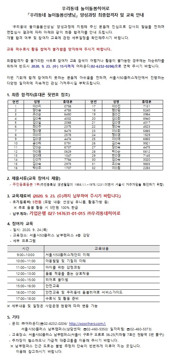 『우리동네 놀이돌봄선생님』 양성과정 최종합격자 및 교육 안내(4차)