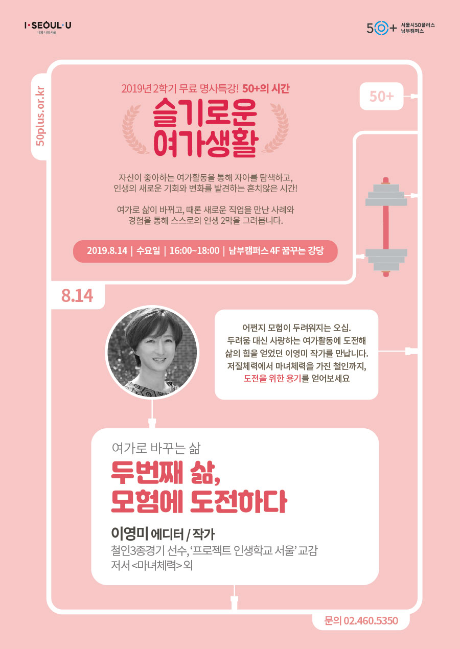 (1 회차) 2019.08.14(16:00 ~ 18:00) 꿈꾸는강당 이영미 어쩐지 모험이 두려워지는 오심. 두려움 대신 사랑하는 여가활동에 도전해 삶의 힘을 얻었던 이영미 작가를 만납니다. 저질체력에서 마녀체력을 가진 철인까지. 도전을 위한 용기를 얻어보세요 없음