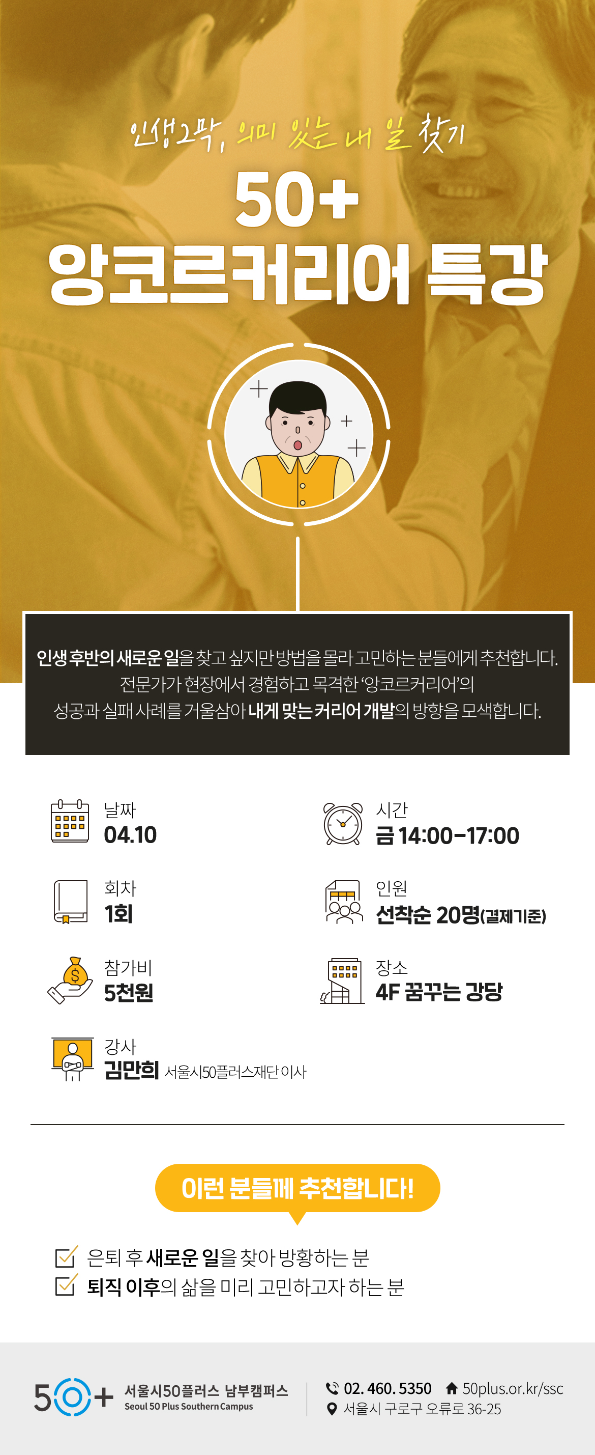 (1 회차) 2020.05.08(14:00 ~ 17:00) 꿈꾸는강당 김만희 인생2막, 의미 있는 내 일 찾기 50+앙코르커리어 특강 없음