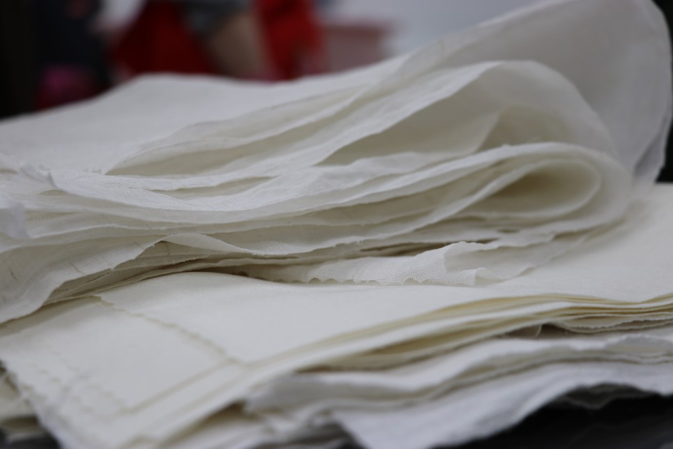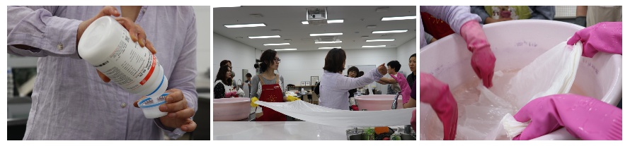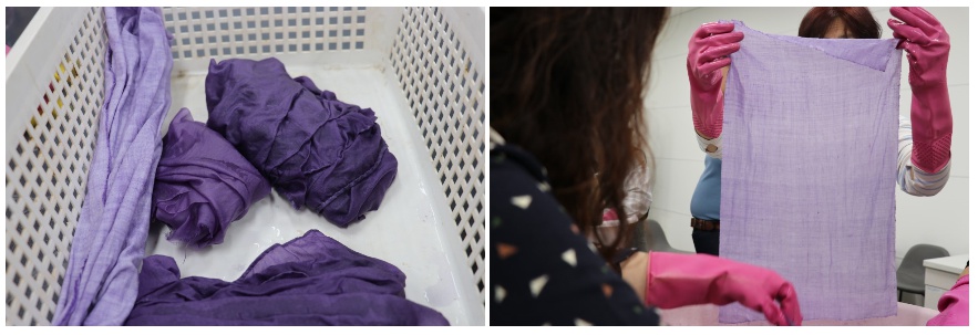 일단 염색할 천을 물에 충분히 적셔서 염액을 흡수 하는 과정에서 얼룩이 지지 않도록 선 작업을 하고, 젖은 천을 주름 잡기를 한 뒤 명반을 넣은 매염제에 넣고 상치기 하는 법을 배웠다. 네 장의 샘플 천도 원단 소재와 성분에 따라 색깔이 어떻게 다르게 나오는지 볼 수 있도록 2인 1조로 돌아가면서 상치기를 했다.