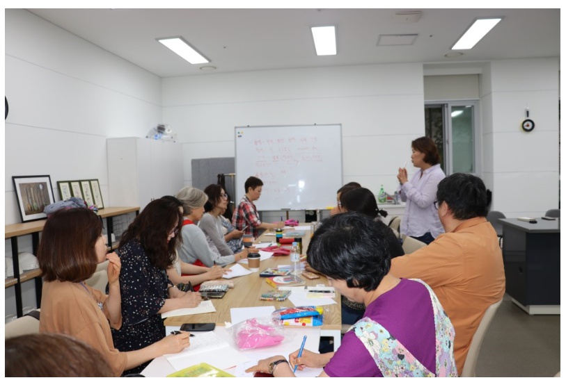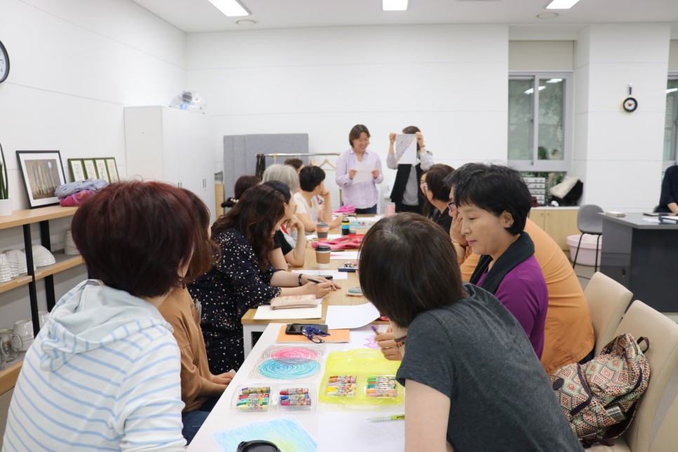‘내 기억 속의 색’이라는 부제로 색에 대한 고정관념을 깨는 시간. 각자의 인생을 돌아보며 떠오르는 색을 그림으로 표현하고 또 발표했다. 어릴 적 딸이라고 빨강색만 고집했던 엄마의 뜨개질. 꽃분홍(핑크 아니죠~)색을 거부했던 유년기, 빨갱이를 상징하는 빨간 색에 대한 터부, 빨간 내복에 얽힌 얘기들…… 색깔을 통해 기억을 들춰보는 여행으로 서로에 대해 조금씩 알게 되고 가까워지는 경험까지 얻게 되었다.