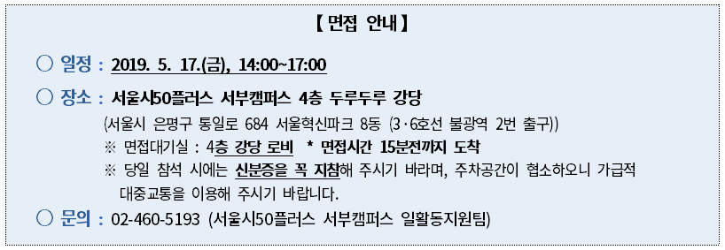 2. 2019 서울시 보람일자리 사업은 1인이 동시에 2개 이상의 보람일자리 세부사업에 참여할 수 없으며, 여러 개의 사업에 신청서를 제출하더라도 최초 선정 된 사업 이외의 사업에는 별도의 고지 없이 심사제외 대상으로 분류 될 수 있습니다.