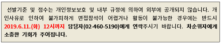 ○ 일시: 2019.6.12.(수)13:30~17:30(면접 10분전 대기 필수)