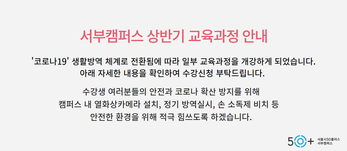 | 50+온라인 성악교실 : 좋은 소리를 위한 발성법 | 7.13-7.22 | 월,수 | 14:00-15:00 | 100 | 무료 | 6.15.(월) | ||||