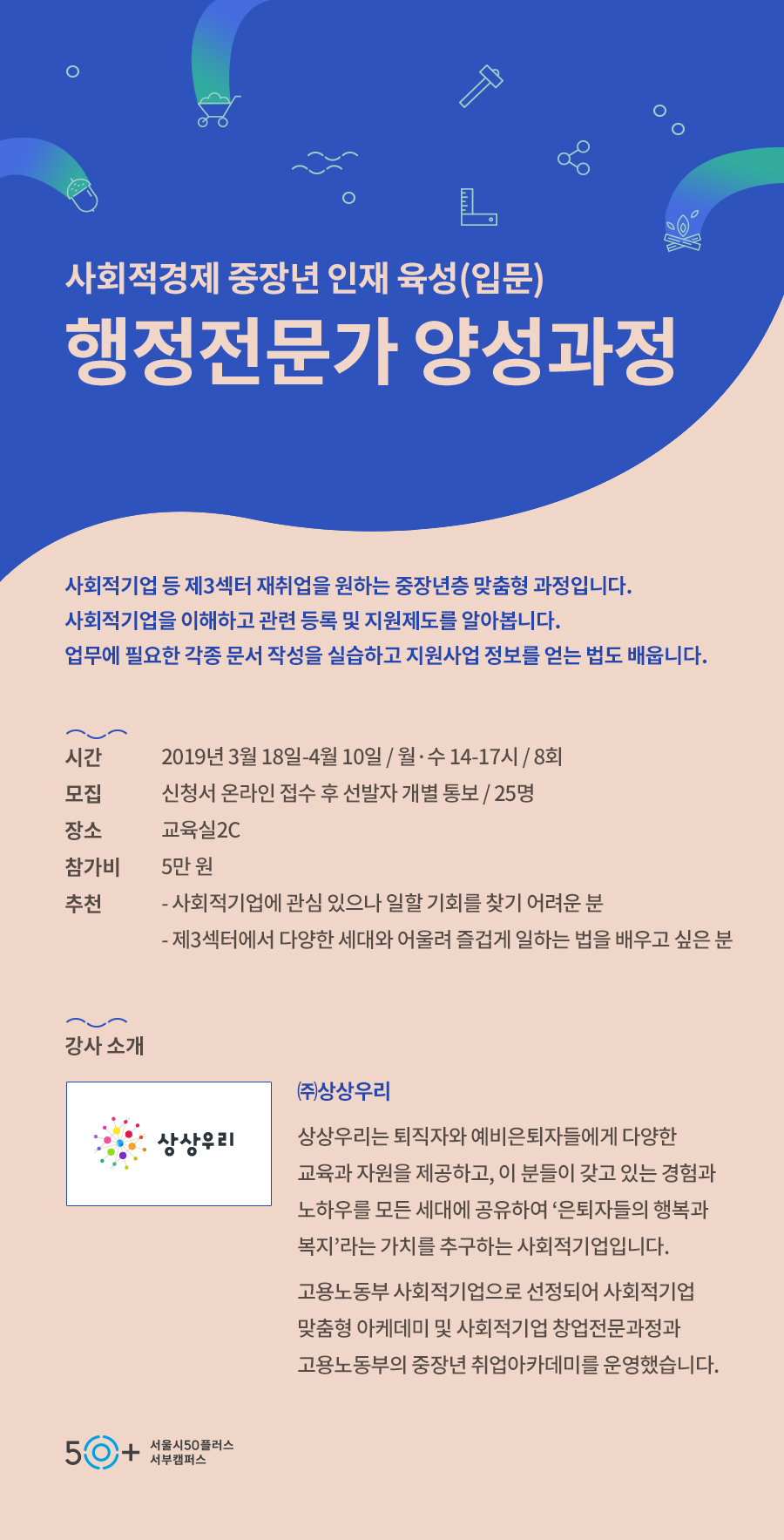 • - 50+세대의 인생 2막 설계와 전직, 취업, 창업을 위한 교육, 컨설팅을 제공합니다.