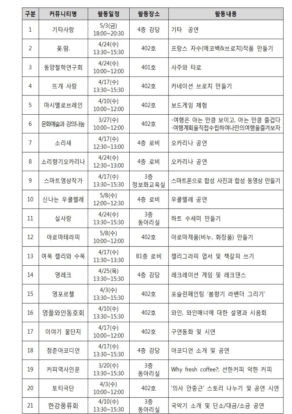 ※ 센터 강의실 사용 현황에 따라 일부 커뮤니티의 일정 및 강의실이 변경되었습니다.