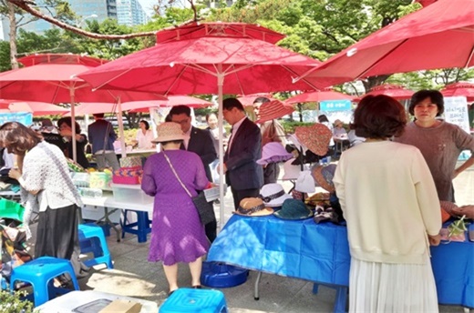 새마을 부녀회 부스에는 중장년들이 생활품을 구경하고 있다.