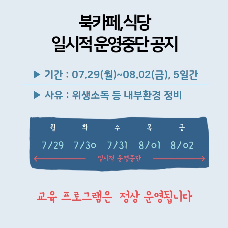 북카페, 식당 일시적 운영중단 공지(7.29~08.02)