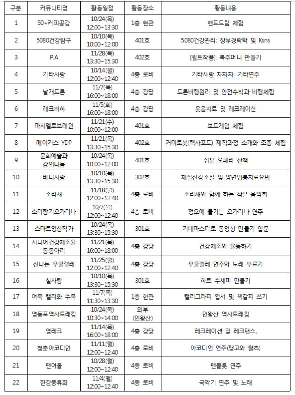 ※ 센터 강의실 사용 현황에 따라 일부 커뮤니티의 일정 및 강의실이 변경되었습니다.