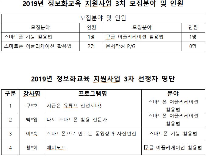2019년 정보화교육 지원사업 3차 강사 선정 결과 발표