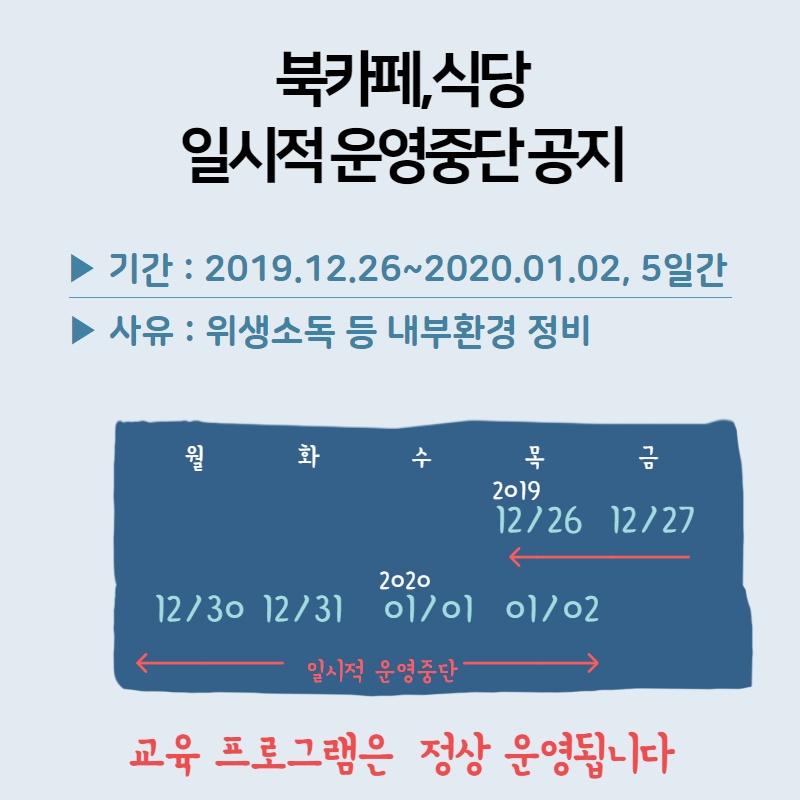 북카페, 식당 일시적 운영중단 공지(19.12.26~20.01.02)