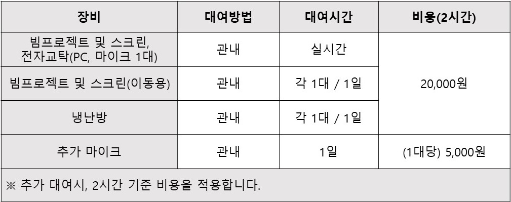 ※ 대여는 2시간을 기준으로 하며, 추가대관도 2시간 단위로 가능합니다. |
